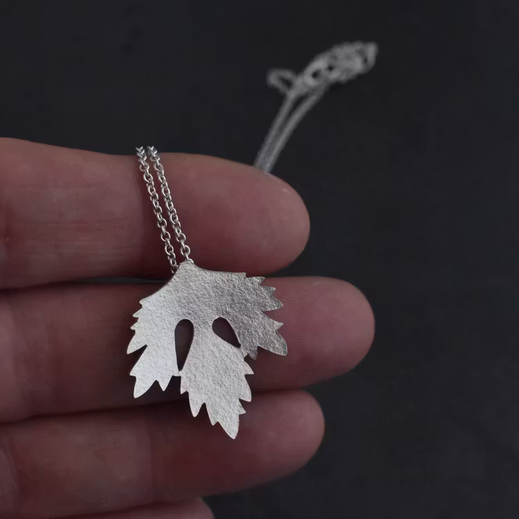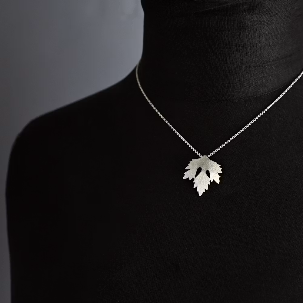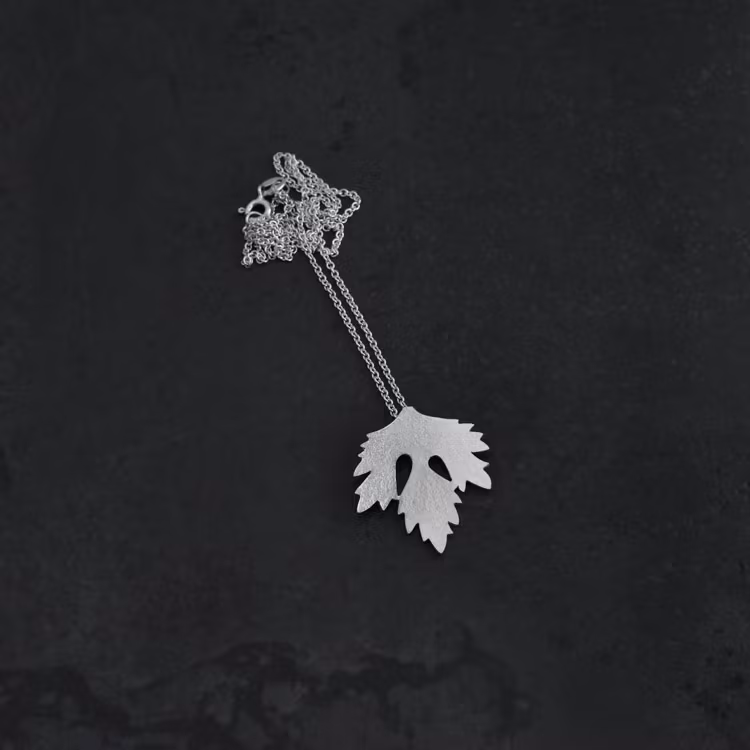 Ett litet persiljeblad som hänge på en kedja. Persiljebladet är ca 2,5 X 2,7 cm och har en lite matt struktur på ytan. Kedjans längd är 42 cm. Tillverkat av silver.
