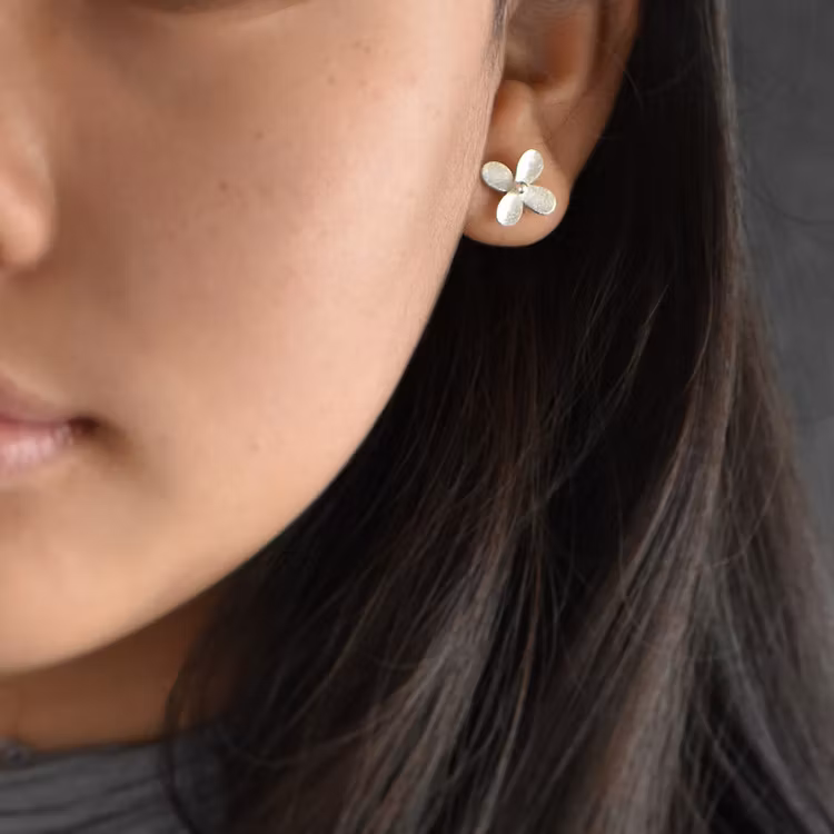 Örhängen av silver i form av små blommor som sitter tätt till örat. Örhängena har en lite präglad yta och det sitter en liten silverkula i mitten av varje blomma. Blommornas diameter är ca 12 mm. Denna modell finns i två storlekar - detta är den lite mindre storleken.