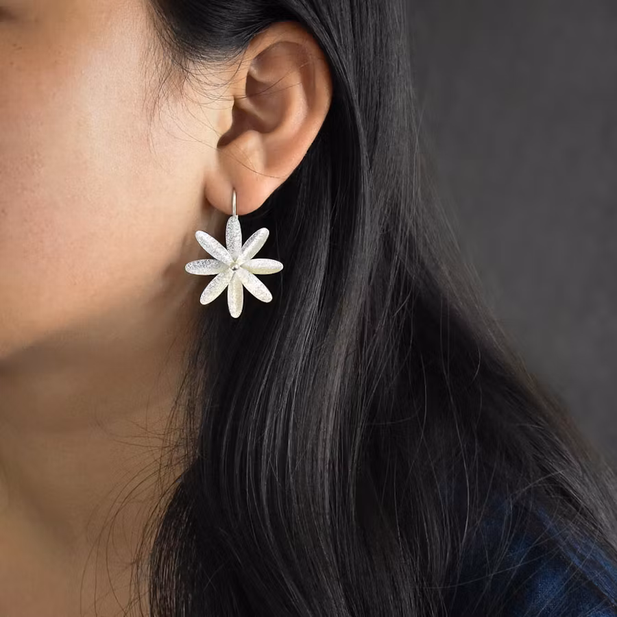 Örhängen i form av blommor med åtta kronblad och en liten silverkula i mitten. Ytan på blommorna är mattpräglad. Öronkroken är fastlödd på baksidan. Full längd inklusive öronkrok är ca 38 mm och blommans diameter är ca 31 mm.