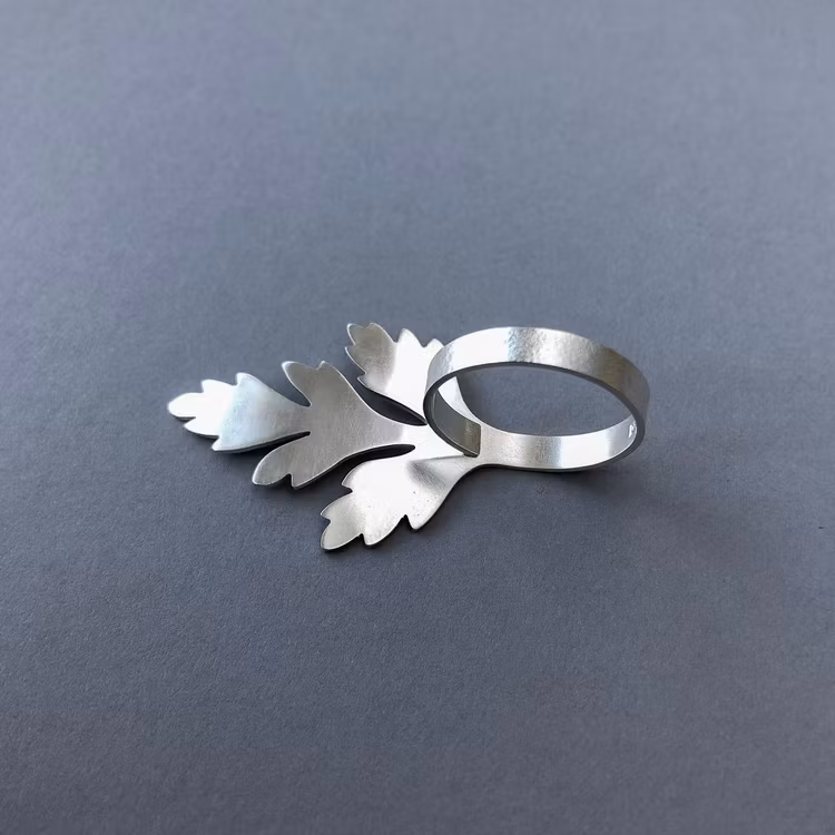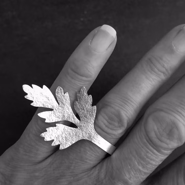 Ring i form av ett Stinknävablad. Tillverkad för hand av silver. Ringstorlek: 62 (19,75). Bladets storlek: ca. 3,4 x 2,7 cm. Ringskenans bredd: 4 mm.